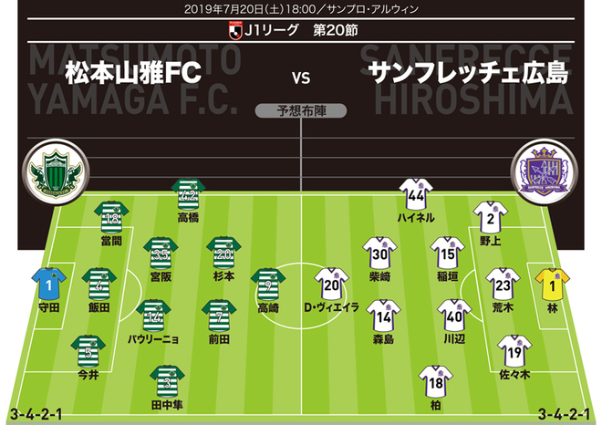 6試合勝利から遠ざかっている17位松本は(2分4敗)、13日のJ1第19節・磐田戦(0-1)から1人変更。MF藤田息吹に代えてMFパウリーニョを起用した。4試合負けなし(2勝2分)の7位広島も鳥栖戦(2-0)から1人を入れ替え、FWパトリックに代わってFWドウグラス・ヴィエイラが先発に名を連ねた。